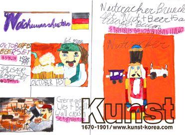분당판교지사의 지은이는 Kunst Travel 수업을 통해 독일이라는 나라에 대해 공부해보고, 자신이 관심있는 주제들을 직접 그려보며 세계에 대한 호기심을 키워가는 시간을 가졌어요. 맥주가 유명한 나라 독일의 옥토버페스트 축제, 베를린장벽, 호두깍기 인형 등 다양한 주제를 지은이만의 그림체와 함께 영어글씨도 써보며 감각적으로 구성해준 작품입니다. 분당판교지사_윤지은(10세)