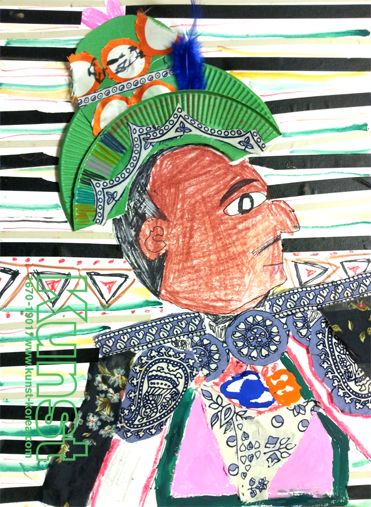 서초지사의 민정이는 kunst kindheit 수업을 하며 멕시코에 대해 공부해보며 멕시코인의 특징을 관찰하고 그려보았습니다. 뚜렷한 이목구비와 오브제를 활용한 이국적인 의상이 눈에 띄는 작품입니다.^^ 서초지사_오민정(8세)