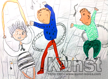 폴짝 폴짝 줄넘기를 하는 친구,풀라우프를 열심히 돌리고 있는 아이들의 그림 속에서 즐겁고 역동적인 운동시간이 느껴집니다. 뛰어올랐을 때의 위로 올라간 머리모양과 정면, 측면의 얼굴 표현 활동적인 동세 등을 자유롭게 표현해 주었습니다. 연필 드로잉 배경과 색종이로 구성된 부분채색이 조화로운 작품입니다. 서초지사_김한준(5세)