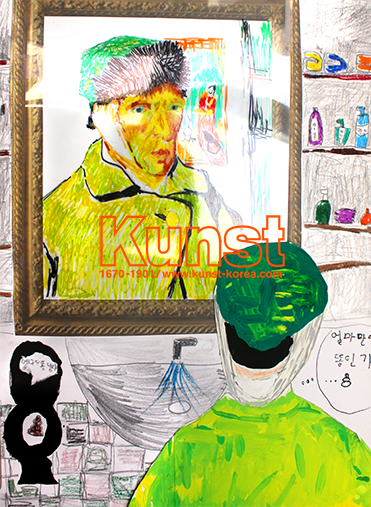 요원이는 오랜만에 화장실에서 쾌변을 한 후, 뿌듯하게 거울에 비친 자신의 모습을 바라보고 있는 고흐의 모습을 그려주었습니다. 재미있는 상상을 통해 자신만의 스토리로 명화를 재창조한 아이디어가 돋보입니다.^^ OHP필름과 사인펜, 색연필, 물감, 연필 등 다양한 재료를 활용한 조화로운 구성감각과 응용력이 멋진 요원이의 고흐입니다. 광주지사_장요원(9세)