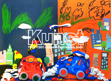 승희는 다양한 재료를 활용하여 부릉부릉 자동차와 주변의 거리를 만들어 보았습니다. 병뚜껑과 색찰흙은 멋진 자동차로 변신하였고, 교재의 패턴지와 색지를 활용한 승희의 드로잉이 함께 어우러져 알록달록하고 생동감있는 배경이 완성되었습니다. 용산지사_이승희(6세)