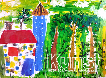 물감을 투명하게만 사용하는 것이 아닌, 짙은 농도로 사용하여 슥슥 긁어도 보고 손으로 찍어도 보며 재료의 다양한 특성을 느껴보았어요. 옆으로 문질러 표현한 초록색의 배경 위에 콕콕 찍은 구름들이 떠다니고, 빨간 지붕의 알록달록한 집이 함께 어울려 마치 동화 속의 한 장면같은 작품을 완성했습니다. 청주흥덕청원_신수민(12세)