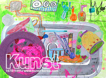 원영이의 씽크대 안에는 설거지가 가득합니다. 직접 그리고 색칠한 컵과 접시를 오려붙이고, 종이접시 오브제도 함께 활용하여 실감나는 화면구성을 해주었습니다. 물감 거품을 불어보고 터뜨려보면서 비누거품의 특성을 재미있게 느껴보고 작품에 응용하였고, 연두색의 배경과 개체들의 다채로운 색감이 감각적인 작품입니다. 전주완산지사_최원영(7세)