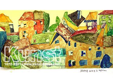 광주지사의 지희는 에곤실레의 삶과 작품세계를 배워보면서 평소와는 새로운 표현기법과 작가의 감성을 이해해보는 시간을 가졌습니다. 노란 색지 위에 에곤실레의 크루마우 마을을 보고 그린 서로 밀접하게 붙어있는 집들의 형태와 붓자국이 드러나는 채색이 조화를 이루며 지희만의 감성으로 재탄생한 작품입니다. 광주지사_오지희(13세)