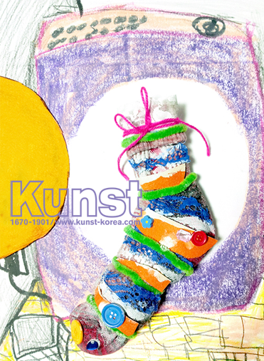 한준이는 실생활에서 매일 신고 접하는 양말을 직접 디자인해보고 세탁기와 함께 화면을 구성해보는 시간을 가졌습니다. 실제의 양말을 재활용하여 그 위에 실과 레이스천, 색지와 단추 등을 이용하여 입체감있고 재미있는 작품을 완성하였습니다. 주위사물이 나만의 멋진 작품이 될 수 있음을 느낄 수 있었던 시간이었습니다. 서초지사_김한준(5세)