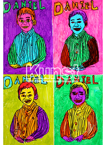 주민이는 앤디워홀의 삶과 작품세계를 배워보며, 작가의 감성을 자신만의 표현기법으로 응용해 보았습니다. 대중적인 이미지를 반복적으로 표현한 앤디워홀처럼, 주민이도 DANIEL이라는 인물을 서로 대비되는 채도높은 색상과 반복표현으로 팝아트적인 느낌을 잘 나타냈습니다. 익살스러운 인물의 표정과 칼라로 현대적인 감각을 재미있게 표현한 주민이의 작품입니다. 청주흥덕지사_박주민(11세)