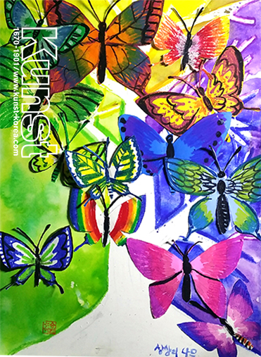 승빈이는 나비들이 가득한 모습을 상상하고 그려주었습니다. 익숙한 이미지의 나비넥타이 모양이 아닌, 실제 나비의 생김새를 자세히 관찰하고, 다채로운 색감과 날개의 특징적인 무늬를 섬세하게 표현한 후, 하나하나 나비를 오려붙여 실제 나비가 날아오르는 것 같은 화려하고 몽환적인 화면을 구성해 주었습니다. 목동양천지사_이승빈(11세)