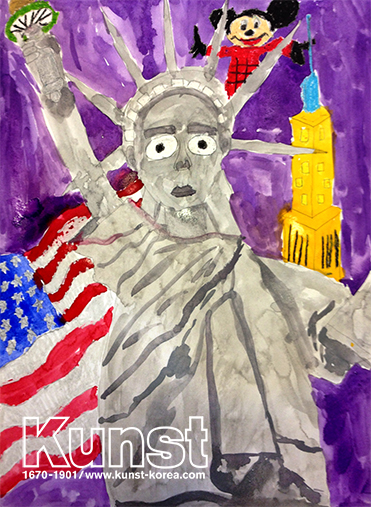 성빈이는 이미지여행을 통해 미국의 문화와 역사, 다양한 건축물들을 배워보고 그림으로 그려주었습니다. 자유 여신상의 옷주름과 얼굴의 이목구비, 평화의 상징인 횃불을 들고 있는 모습을 자신만의 감성으로 재미있게 그려낸 관찰력과 표현력이 돋보입니다. 미국을 상징하는 색감있는 이미지들을 배경에 응용하며, 무채색의 자유의 여신상을 더욱 부각시켜 화면을 완성한 성빈이의 작품입니다. 광주지사_이성빈(11세)