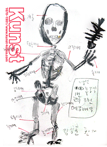 광주지사의 정민이는 KUNST KINDHEIT수업을 통해 인체의 구조를 그려보며 각 뼈의 위치를 알아보고, 직접 명칭도 적어보았습니다. 뼈의 모습을 구조적으로 잘 파악하여 표현하였고, 직접 처방전도 함께 만들어주며, 약을 지어봤던 인체와 관련된 정민이의 경험을 자연스럽게 표현한 작품입니다. 광주지사_이정민(8세)