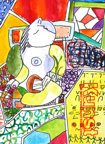 경남김해지사의 남령이는 Kunst Kinder Museum 수업을 통해 다양한 시점과 패턴을 응용하여, 다채로운 화면을 구성했습니다. 실제 인물과는 조금 다르게 표현한 피카소의 기법을 따라 의자에 앉아 책을 읽고 있는 사람의 모습을 곡선적인 조합으로 표현하였고, 배경에는 여러가지 기호와 색감을 응용한 직선적인 분할로 성실하게 그림을 그려본 남령이의 작품입니다. 경남김해지사_임남령(11세)