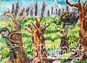 수빈이는 KUNST TRAVEL을 통해 마다가스카르를 여행해보며 다양한 기후와 역사, 새로운 동식물들을 만나보았습니다. 여우원숭이의 특징을 잘 관찰하여, 털의 느낌과 동물의 동세를 재미있게 그려주었고, 굽이치는 연두빛 풀들을 집중력있게 가득 채워 화면을 더욱 풍성하게 하였습니다. 같은 수채화를 사용했지만 붓터치 크기에 따라 주제들을 다양하게 표현한 작품입니다. 광주지사_박수빈(14세)