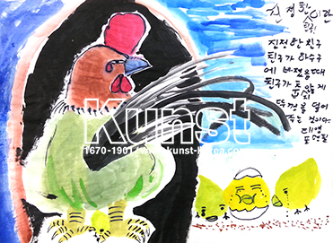 광주지사의 태영이는 KUNST FACTORY 수업을 하며 동양화에 대해 배워보고, 닭과 병아리들을 그려주었습니다. 옅게 채색한 후, 그 위에 펜으로 세밀한 묘사도 해보고 진정한 친구의 의미에 대해 유머러스한 자신의 생각도 적어보며, 화선지 위에 동양화식의 표현을 마음껏 보여준 태영이의 작품입니다. 광주지사_고태영(10세)