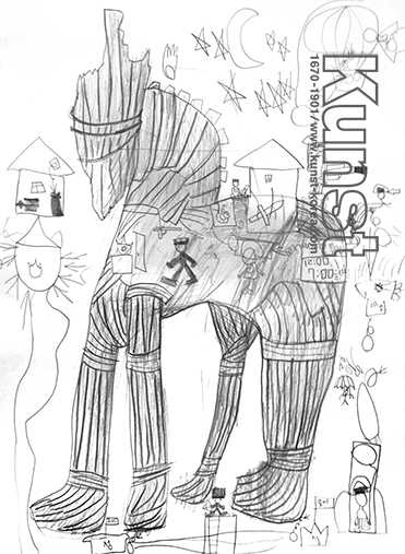 해운대지사의 예준이는 KUNST TRAVEL 그리스 여행을 하며 트로이목마 전투이야기를 듣고 자신의 감성을 마음껏 표현했습니다. 커다란 목마 안에 수많은 병사들이 움직이고 있는 모습이 재미있으며, 밀도에 따라 달라지는 연필의 효과를 잘 살려 주제물을 돋보이게 한 점이 눈에 띕니다. 자유로운 드로잉과 함께 자신의 유머러스한 상상을 잘 표현한 예준이의 작품입니다. 해운대지사_박예준(9세)