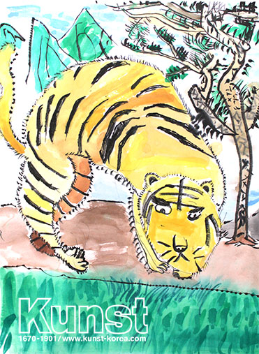 경남김해지사의 현동이는 HISTORY&CLASSIC 수업을 하며 동양화에 대해 배워보고, 화선지 위에 호랑이와 소나무를 그려주었습니다. 호랑이의 정면을 응시하는 표정과 꼬리를 세우고 웅크리고 있는 자세, 소나무잎의 사실적인 표현 등 펜과 붓의 굵기를 적절하게 사용하여 화면의 율동감을 잘 살린 현동이의 작품입니다. 경남김해지사_이현동(10세)