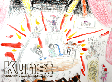 경남김해지사의 동혁이는, 친구들과 함께 즐거운 연주회가 열리는 장면을 표현해주었습니다. 다양한 모형, 음표로 시끌벅적 신나는 사운드가 들리는 듯한 분위기 연출과 적절히 강조된 레드 색감이 매력적입니다. 오밀조밀하며 세밀하게 그려진 인물표현에서 동혁이의 섬세함과 형태감각을 느낄 수 있는 멋진 작품입니다. 경남김해지사_김동혁(8세)