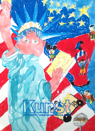 Kunst Travel 수업을 통해 선생님과 함께 미국을 공부하며 인상적이었던 내용들을 그림으로 표현해 보았습니다. 미국을 상징하는 국기의 빨강과 파랑의 칼라 구성, 별모양의 활용으로 작품을 더욱 화려하게 표현한 감각이 돋보입니다. 대표 상징물인 자유의 여신상을 자신만의 그림풍으로 색다르게 표현하였고, 미키마우스와 다양한 인물 구성이 화면을 재미있게 만들어 줍니다. 목동양천지사_정세인(8세)