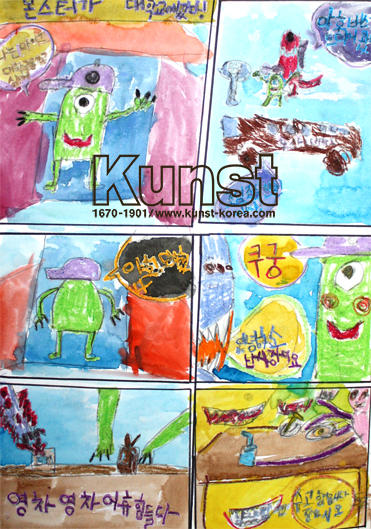도윤이는 KUNST KINDHEIT 프로그램을 통해, 주제와 스토리를 자연스럽게 연계하여 웹툰형식으로 '몬스터대학교' 를 표현해주었습니다. 도윤이만의 재기발상하며 통통튀는 발상이 돋보이며, 물감과 크레파스의 절묘한 조화와 여유있는 공간활용이 매력적인 멋진 작품입니다. 광교영통지사_김도윤(8세)