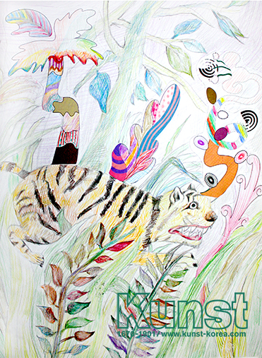 광주지사의 승현이는 KUNST KINDER MUSEUM를 통해 앙리 루소의 삶과 작품세계를 배워보고, 작가의 감성으로 이국적인 정글의 이미지를 그려보았습니다. 알록달록한 다양한 형태의 식물들과 호랑이를 색연필로 세밀하게 표현하여, 원작의 강한 느낌과는 사뭇 다른 부드러운 분위기가 느껴지는 작품입니다. 광주지사_김승현(15세)