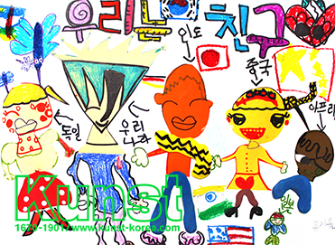 광주지사의 지민이는 KUNST KINDHEIT 수업을 하며 색종이와 기본채색도구를 이용하여, 여러 나라의 친구들 모습을 재미있게 표현했습니다. 우리는 친구라는 주제로 각 나라의 국기들과 함께 그려준 생동감있는 표정의 인물들이 미소를 자아냅니다. 형식에 얽매이지 않고, 자신의 감성을 자유롭게 표현한 멋진 작품입니다. 광주지사_유지민(7세)