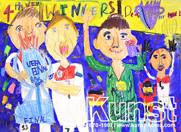 영등포지사의 하영이는 KUNST TRAVEL 수업을 통해 독일의 문화와 역사, 다양한 유적지를 배워보았습니다. 독일의 축구대표팀이 우승을 해 멋진 트로피를 들고 환호하는 모습을 그려주었어요. 관찰하여 표현한 유니폼에서 실제감이 느껴지며, 즐거워하는 사람들의 표정과 파란 배경 위에 흩날리는 종이들이 경쾌한 분위기를 자아냅니다. 영등포지사_정하영(9세)