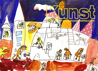 경남김해지사의 선우는 KUNST KINDHEIT 수업을 하며 괴물피자가게를 그려주었습니다. 공룡의 모습을 한 괴물들이 하나둘씩 가게 안으로 모여들어 피자를 맛있게 먹고 있어요. 어두운 배경채색이 흰 바탕의 피자가게와 대비되어, 건물 안은 마치 불을 환하게 켠 분위기를 연출합니다. 형식에 얽매이지 않고 자신의 생각을 재미있게 풀어낸 표현력이 돋보이는 작품입니다. 경남김해지사_김선우(6세)