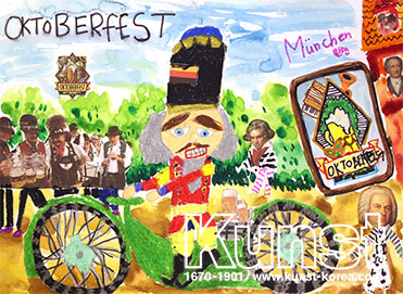 용인수지지사의 연우는 KUNST TRAVEL 수업을 하며 독일의 다양한 문화와 유적지, 축제 등을 배워보았습니다. 자전거를 탄 호두까기 인형과 옥토버페스트 축제를 알리는 간판, 축제를 즐기는 사람들, 음악의 거장 베토벤이 한자리에 모여있습니다. 실제 이미지와 이어 그린 그림이 조화롭게 어우러져 재미있는 구성을 보여주는 작품입니다. 용인수지지사_김연우(10세)