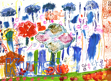 청주상당지사의 연희는 WALDORF KINDERGARTEN 수업을 하며 알록달록 마을을 그려주었습니다. 스폰지로 콕콕 찍어도 보고 문질러도 보며 표현한, 시원한 빗줄기가 내리는 구름과 사인펜, 물감으로 자유롭게 표현한 마을의 풍경이 어우러져 다채로운 화면을 구성합니다. 재료의 특성을 깊이 있게 이해하고 주제 속에서 알맞게 반영한 응용력이 돋보이는 작품입니다. 청주상당지사_송연희(8세)