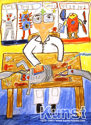 용산지사의 지훈이는 KUNST EVERYDAY & EVERYART 수업을 하며, 자신의 직업에 대해 상상해보고 표현하였습니다. 미래의 지훈이는 로봇을 만들고 고치는 기술자가 되어 있어요. 다양한 기능을 가진 로봇들이 전시되어 있고, 지훈이는 진지한 표정으로 로봇을 수리하고 있어요. 자신의 관심사를 반영하여 미래의 직업을 즐겁게 화면에 담아낸 지훈이의 작품입니다. 용산지사_윤지훈(10세)