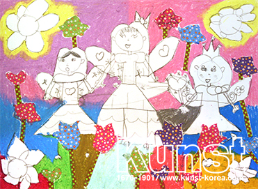 용인수지지사의 예은이는 WALDORF KINDERGARTEN 수업을 하며, 꽃밭의 요정들을 그려주었어요. 평소에 익숙하게 개체를 채색하는 방식이 아닌, 배경을 알록달록하게 채색하여 사랑스러운 드로잉을 더욱 돋보이게 합니다. 용인수지지사_오예은(9세)