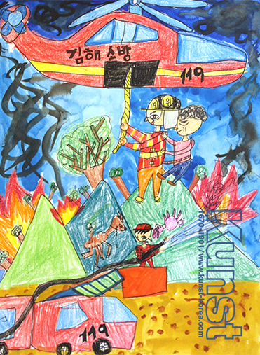 경남김해지사의 석빈이는 KUNST EVERYDAY & EVERYART 수업을 하며, 산불을 끄는 소방대원들과 소방차, 구조헬리콥터 등을 그려주었습니다. 검은 연기가 나는 산에서 할머니와 동물을 구해내고 있는 소방대원들의 현장감있는 모습과 자신감있는 드로잉에서 석빈이만의 개성을 느낄 수 있습니다. 경남김해지사_이석빈(10세)
