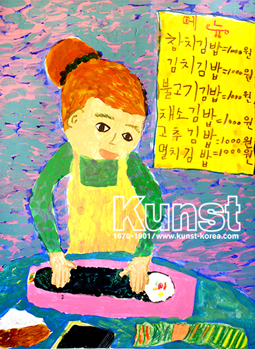 영등포지사의 민지는 KUNST KINDER MUSEUM 수업을 하며 고흐의 표현기법을 응용하여 김밥을 맛있게 만들고 있는 인물을 그려보았습니다. 강렬한 색과 풍부한 붓터치, 사실적인 주변 풍경이 재미있는 작품입니다. 영등포지사_안민지(9세)