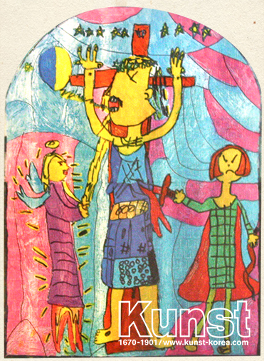 영등포지사의 하영이는 KUNST KINDER MUSEUM 수업을 하며 샤갈의 삶과 작품세계를 배워보았습니다. 성서 이야기를 작품주제로 많이 그렸던 샤갈처럼, 하영이도 예수님의 십자가사건을 스테인드글라스 형식으로 표현하였습니다. 인물들의 특징과 이야기 구성, 다채로운 색감이 조화를 이루는 작품입니다 영등포지사_정하영(10세)