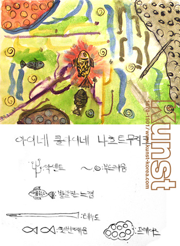 광주지사의 서원이는 KUNST KINDER MUSEUM 수업을 하며 추상미술의 대가인 바실리 칸딘스키의 기법을 배워보았습니다. 모자르크의 [Eine kleine Nachtmusik] 음악을 듣고 느낌을 상징화하여 적어본 후, 회화로 표현한 응용력이 돋보입니다. 광주지사_정서원(10세)
