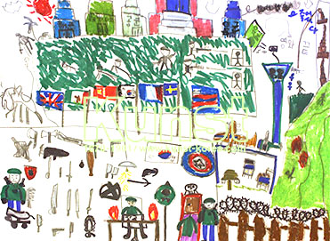 영등포지사의 지호는 WALDORF KINDERGARTEN 수업을 하며 배운 국기표현을 응용하여, 공군, 육군, 해군 등 다양한 군인들이 한곳에 모여 훈련을 하는 모습을 표현해 주었습니다. 다양한 상황의 이야기 구성이 재미있는 작품입니다. 영등포지사_박지호(8세)