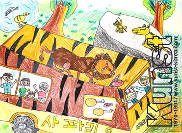 경남김해지사의 석빈이는 NATURAL & SCIENCE 수업을 하며 사파리 버스를 타고, 동물들을 만났던 경험을 그림으로 표현해주었습니다. 동물들을 신기하게 바라보고 있는 사람들, 사파리 버스 위에 올라간 사자와 여유로운 시간을 보내고 있는 동물들의 모습이 재미있는 작품입니다. 경남김해지사_이석빈(10세)