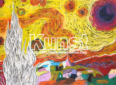 청주상당지사의 윤지는 KUNST KINDER MUSEUM 수업을 하며 고흐의 삶과 작품세계를 배워보았습니다. 원작 별이 빛나는 밤의 푸른빛과 대조적으로 난색 계열을 사용하여 밝고 따뜻한 느낌으로 응용하여 표현한 점이 인상적입니다. 청주상당지사_장윤지(13세)