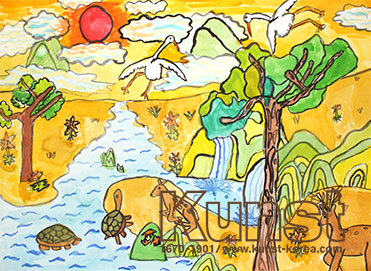 대구수성지사의 현지는 KUNST FACTORY 수업을 하며 소나무, 사슴, 거북이, 학 등 십장생을 그려주었습니다. 붉은 해와 굽이굽이 이어지는 산등성이, 자연 속에서 즐겁게 뛰노는 동물들을 동양화적으로 구성력있게 표현하였습니다. 대구수성지사_김현지(10세)
