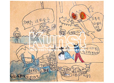영등포지사의 루빈이는 WALDORF KINDERGARTEN 수업을 하며, 만화가가 되어 보았습니다. 도깨비 방망이를 들고 눈에 불을 내뿜는 아이, 물고기로 변한 사람 등 비상금을 두고 벌어지는 이야기를 흥미진진하게 잘 표현한 작품입니다. 영등포지사_염루빈(9세)