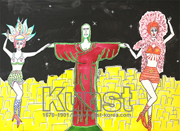 남양주지사의 나연이는 KUNST TRAVEL 수업을 하며 브라질을 여행해 보았습니다. 삼바춤을 추는 두 여인이 그리스도상의 손을 잡고 멋진 포즈를 취하고 있어요. 그리스도상의 양팔을 벌리고 있는 모습에서 재미있는 이야기를 떠올린 나연이의 유머감각이 돋보이는 작품입니다. 남양주지사_김나연(14세)