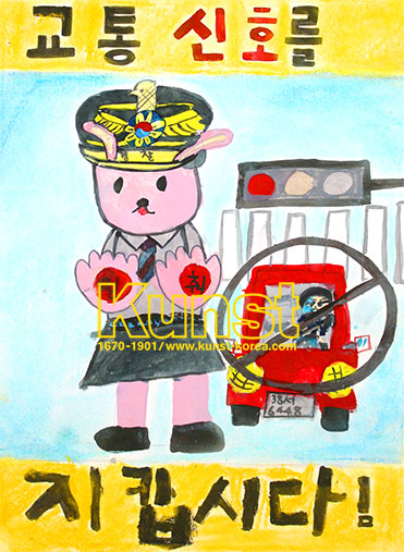 청주흥덕지사의 윤아는 EVERYDAY & EVERYART 수업을 하며, 교통안전 포스터를 그려보았습니다. 신호등 위에 빨간 신호가 켜져 있고, 경찰 마스코트인 포순이가 멈춰라고 쓰여 있는 손바닥을 앞으로 내밀고 있어요. 교통신호를 지키자는 이미지와 문구가 함께 어우러져 메시지를 전달력있게 표현한 작품입니다. 청주흥덕지사_전윤아(10세)