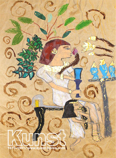 대구동구지사의 효원이는 KUNST TRAVEL 수업을 하며 이집트의 문화와 역사, 유적지 등을 배워보고 그림으로 표현해 보았습니다. 소포지 위에 크고 작은 이집트 인들과 탁자, 식물 등을 그리고 금빛 물감으로 부분 채색을 하여 완성하였습니다. 대구동구지사_윤효원(11세)