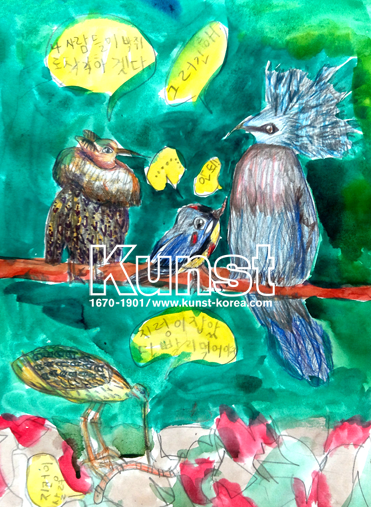현지는 집에서 코코라는 예쁜 새를 키우며 새를 참 좋아합니다. 그래서인지 일차원적으로 새를 그리는 것이 아닌, 실제 생물의 구체적인 형태를 관찰한 후, 각각 새들이 갖고 있는 깃털의 색감과 결을 섬세하고 감각있게 묘사해 주었고, 생명력있는 새들의 재미있는 대화로 스토리를 풀어나간 현지의 응용력과 화면구도가 돋보입니다. 목동양천지사_서현지(7세)