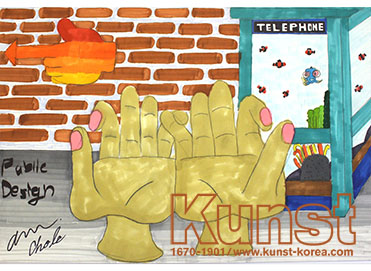 혜원이는 KUNST DESIGN ART SCHOOL 수업을 하며 공공 디자인에 관해 이해해보고, 공간에 맞는 디자인을 직접 계획 및 표현해 보았습니다. 손바닥을 보인 채 새끼 손가락을 걸고 있는 손가락 의자와 텔레폰 박스 수족관, 손가락 모양의 표시판 등 위트와 상상력이 가득 담긴 디자인을 완성하였습니다. 용인수지지사_윤혜원(11세)