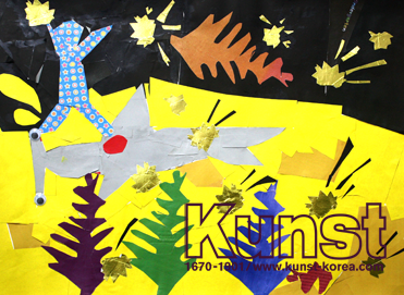 강유는 이카루스 이야기를 듣고, 하늘에서 추락하여 죽는 이카루스를 살리고 싶다며, 마티스의 원작에서 동경심을 가진 인간의 마음을 상징하는 빨간 색의 심장을 귀상어에게 그려주었고, 귀상어가 대신 쿠션이 되어 이카루스를 살려냈습니다. 마티스의 작품에서 파란색 배경이 떨어지는 하늘을 의미한다면, 강유의 이카루스는 하늘에서 바다로 별똥별이 떨어지는 밤으로 응용되었습니다. 분당판교지사_이강유(8세)