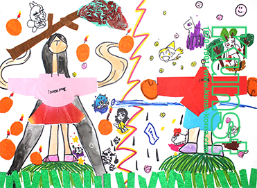 대전유성구지사의 서연이는 MAKE & PLAY 수업을 하며 종이로 옷을 접어보고, 드로잉을 더하여 화면을 구성해 주었습니다. 우뚝 서 있는 큰 두 사람과 그 주위를 날고 있는 개성 가득한 캐릭터들이 어우러져 경쾌한 분위기를 자아냅니다. 대전유성구지사_이서연(11세)