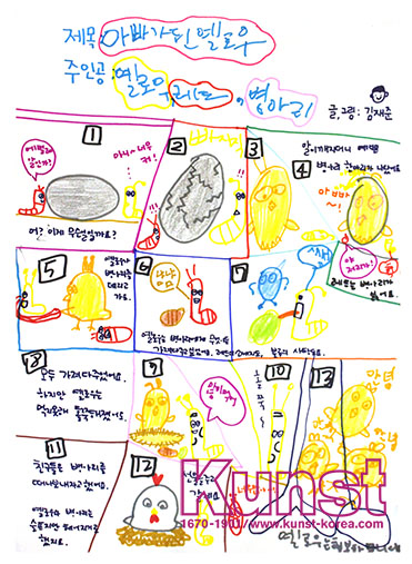 청주상당지사의 재준이는 WALDORF KINDERGARTEN 수업을 하며, "아빠가 된 옐로우" 라는 제목의 만화를 그려보았습니다. 만화영화인 "라바" 속 주인공 옐로우와 레드와 함께 새로운 캐릭터 병아리를 등장시킨 아이디어와 사인펜을 활용한 글과 그림의 감각적인 조화가 멋진 작품입니다. 청주상당지사_김재준(8세)