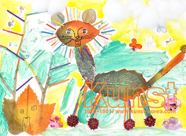 용인수지지사의 영현이는 WALDORF KINDERGARTEN 수업을 하며, 나뭇잎으로 사자를 표현해 주었습니다. 솜 뭉게구름 아래에 개구진 표정을 한 나뭇잎 사자가 정면을 바라보고 있습니다. 자연적인 재료와 다양한 오브제를 조화롭게 활용한 영현이의 작품입니다. 용인수지지사_이영현(8세)