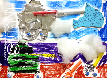 은박접시의 빛나는 재질의 특성과 빨대를 이용한 단단한 느낌의 탱크와 군인들이 타고 있을 것 같은 녹색, 검은 줄무늬의 탱크의 표현이 재미있습니다. 하늘을 나는 비행기는 푸른색 접시 위에 율언이만의 드로잉 느낌을 살려 그린 후, 오려 붙여 구성하였고, 주변은 솜으로 뭉게구름을 만들어 화면을 더욱 풍성하게 해줍니다. 일산지사_김율언(7세)