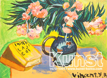 용인수지지사의 영경이는 KUNST KINDER MUSEUM 수업을 하며, 빈센트 반 고흐의 삶과 작품세계를 이해해보고 [협죽도가 있는 정물, 1888] 을 모작해 주었습니다. 꽃병 한가득한 협죽도의 분홍빛 꽃과 풍성한 잎을 섬세하게 그려주었으며, 탁자 위에 놓인 두 권의 책과 연둣빛 배경이 어우러져 원작의 느낌을 잘 살려 표현해준 작품입니다. 용인수지지사_이영경(11세)