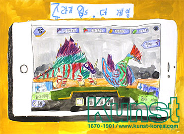 용인수지지사의 호윤이는 KUNST THINK & CREATIVE 수업을 하며, 다양한 공룡들이 등장하는 모바일 게임인 [Jurassic World™_The Game]의 한 장면을 그려주었습니다. 공룡 캐릭터와 게임 속 아이콘들을 세부적으로 표현하여 마치 실제 모바일 게임을 보는 듯한 느낌이 드는 작품입니다. 용인수지지사_최호윤(10세)